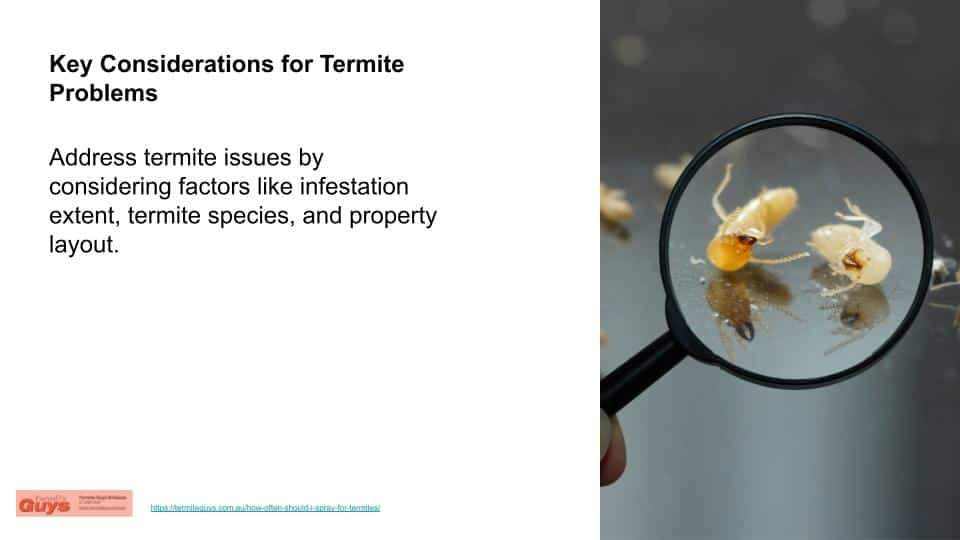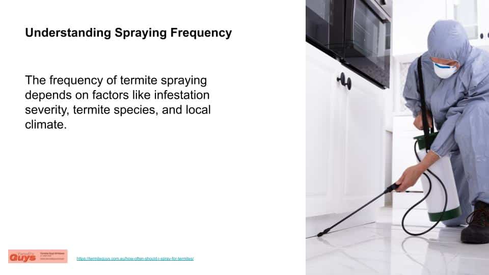 However, it’s essential to understand that these recommended intervals aren’t one-size-fits-all. Various factors can influence the ideal spraying frequency. These include the specific species of termites in the area, the extent of the current infestation, and even the region’s geographical conditions.